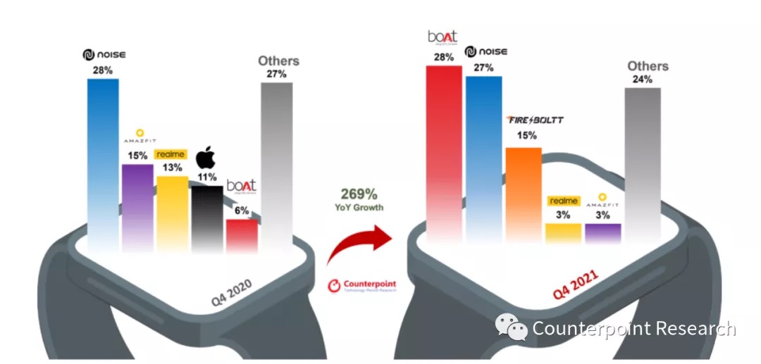 依据Counterpoint 的IoT Service 最新研讨显现,2021年印度智能手表商场出货量同比增加逾越274%, 创前史新高。此外,跟着第四季度同比增加逾越8%,2021年第四季度的出货量达该商场有史以来的最高。