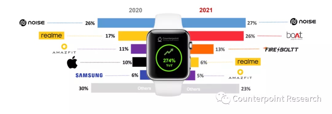 研讨助理Harshit Rastogi在谈论商场趋势时说:“印度品牌占有了逾越75%的商场比例。2021年出货量前三名的品牌占有了智能手表商场比例的三分之二,而在2020年仅为一半。2021年又有逾越10家的新品牌进入商场,加重了竞赛。考虑到产品的高需求和品牌商为带来更多额定功用所投入的研制力度,估计在2022年智能手表商场出货量将增加约50%。”