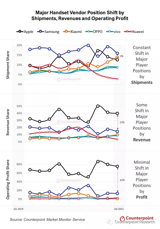从出货量的视点来看,全球智能手机品牌商排名不断改变,比方小米在2021年二季度成为全球出货量第二的手机厂商。但是,从收入和经营赢利的视点来看,在曩昔几个季度里,厂商排名却几乎没有任何改变。