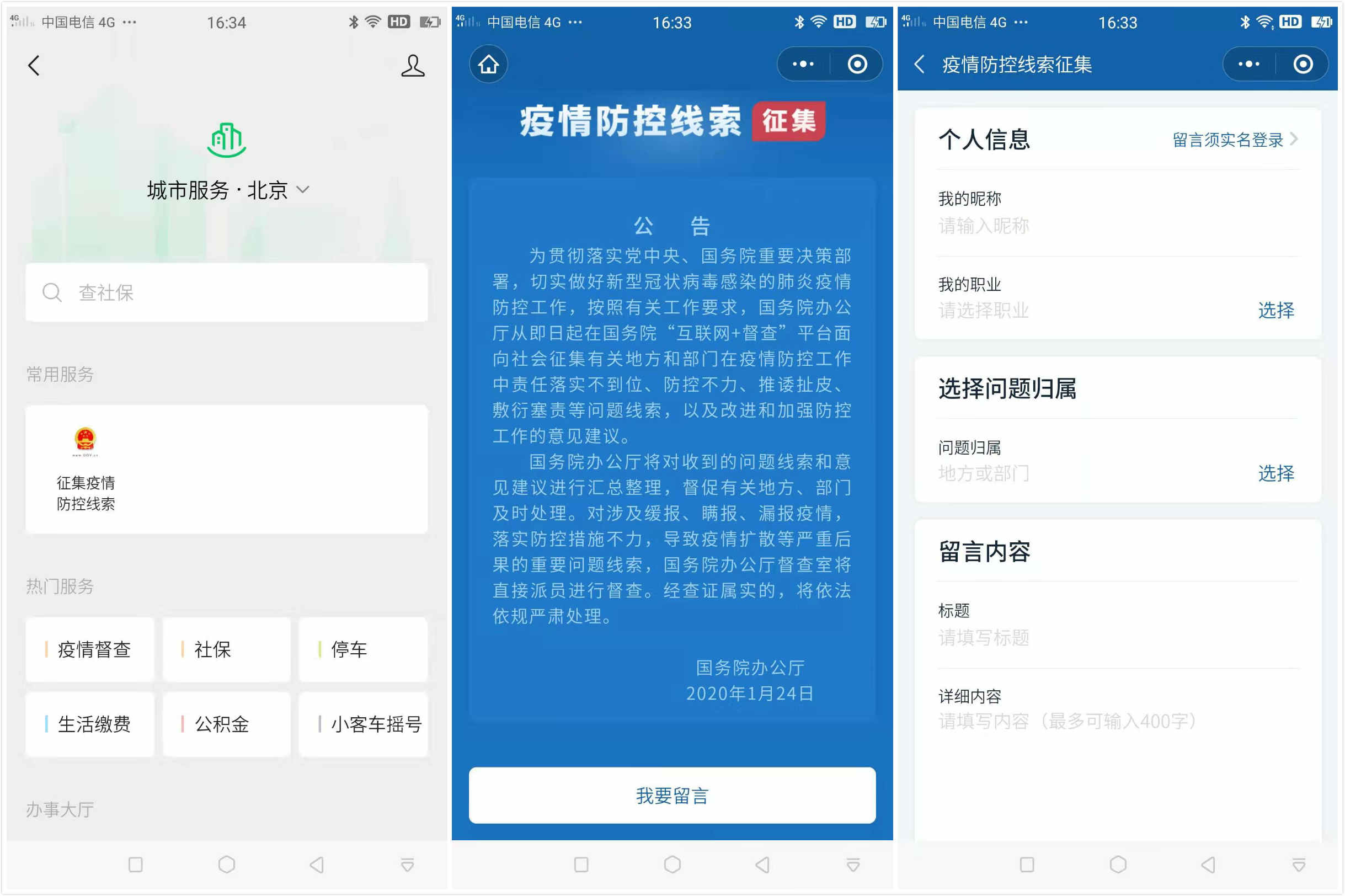 1月25日音讯,归纳新京报等媒体音讯,日前,微信的“城市服务”功用上线了“疫情监察”进口,市民可通过留言功用,实名供给疫情头绪和定见主张。点击该进口后,页面会跳转至“国务院客户端”小程序的“疫情防控头绪搜集”页面。