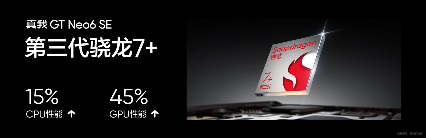 真我GT Neo6 SE搭载第三代骁龙7+旗舰芯,它的制程工艺、中心架构都与第三代骁龙8看齐,可谓是“芯出同门”。比较于上一代,第三代骁龙7+的CPU功用提高15%,GPU功用提高45%,功用体现可谓“小8Gen3”。